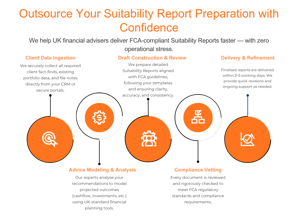 We assist in gathering and organising client information, conducting detailed financial research, and preparing all essential documentation required before drafting Suitability Reports. By managing these time-intensive tasks efficiently, we enable advisors to focus on client relationships, strategic planning, and delivering high-quality, FCA-compliant advice.